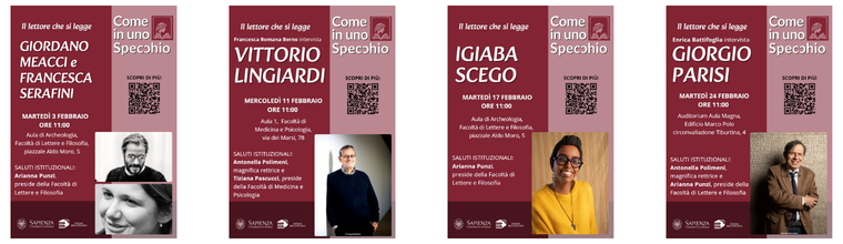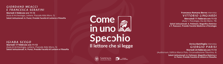 Il progetto Come in uno specchio: il lettore che si legge. Percorsi di biblioterapia si conclude con un ciclo di quattro incontri all’interno della Città universitaria della Sapienza. Cinque scrittrici, scrittori, studiosi e personalità del mondo accademico e scientifico sono stati invitati a raccontare il proprio percorso di formazione e realizzazione: i tentativi, i fallimenti, le scoperte e il ruolo che i libri e la lettura hanno avuto nel definire la loro vocazione. Un racconto degli inizi pensato in particolare per le studentesse e gli studenti, ma che ha un forte valore di esempio positivo e ispirazione per tutti.